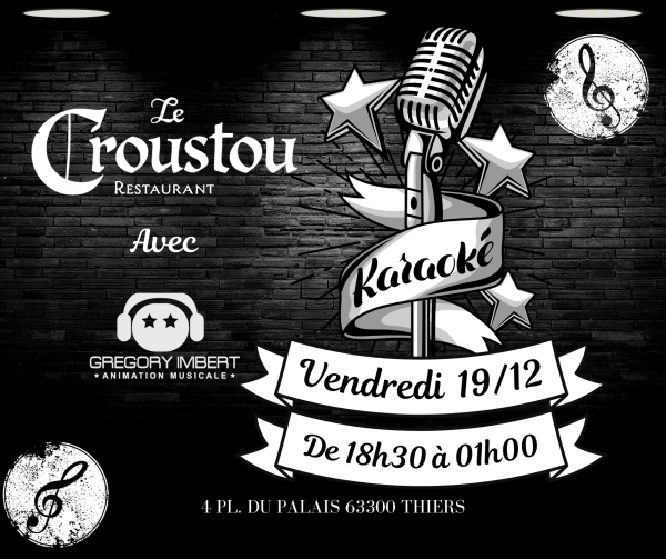Le restaurant Le Croustou à Thiers vous invite à découvrir une programmation festive tout au long de l’année. Soirées karaoké, concerts live, animations musicales ou événements à thème rythment la vie du restaurant et transforment chaque soirée en moment de partage. Situé à Thiers, à proximité du centre-ville, de la Cité des Couteliers et des bords de la Durolle, Le Croustou est l’adresse idéale pour sortir, chanter et profiter d’une ambiance chaleureuse. Que vous soyez de Thiers, de Peschadoires, Escoutoux ou des environs, retrouvez-nous pour des événements conviviaux dans un restaurant animé à Thiers.